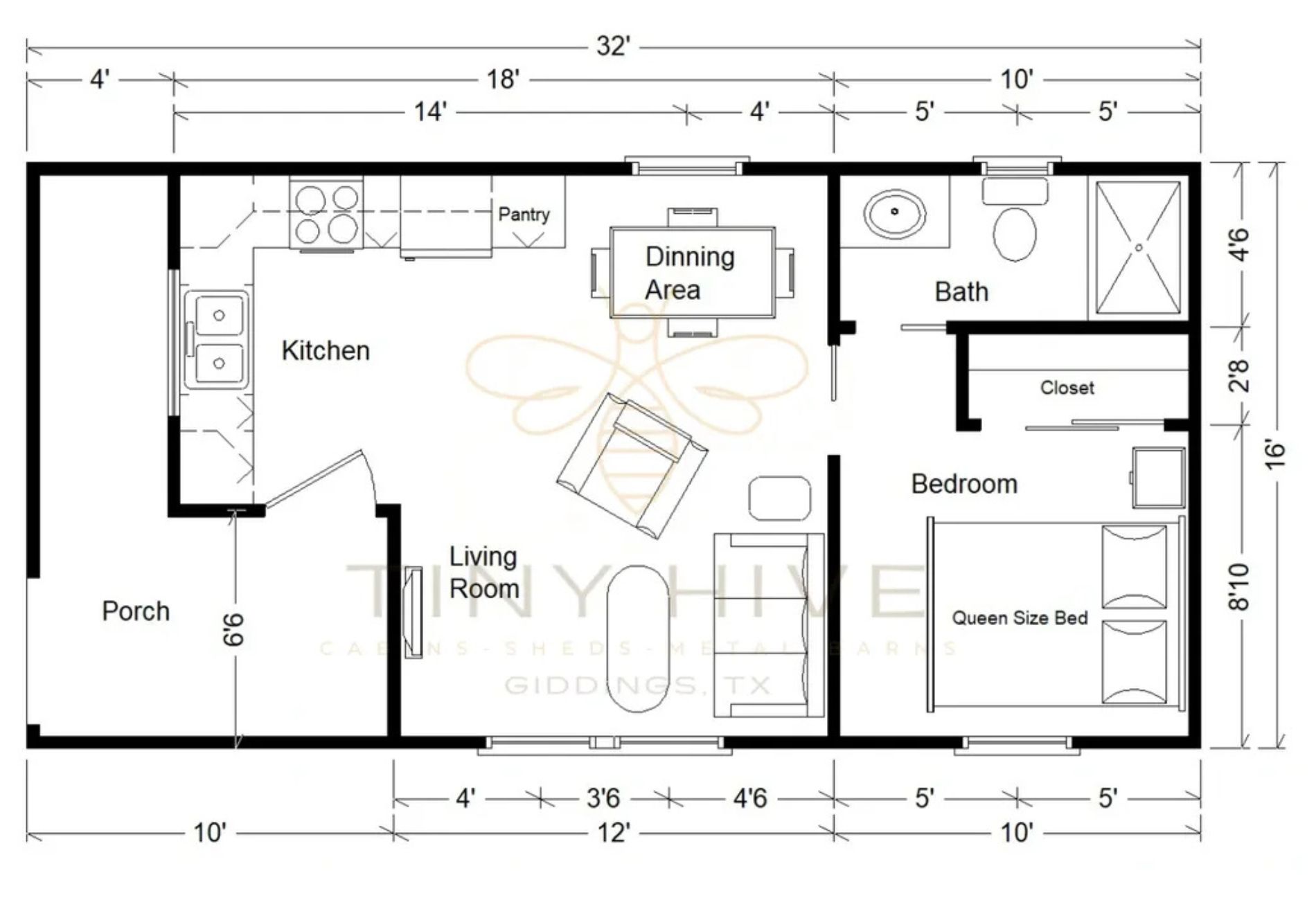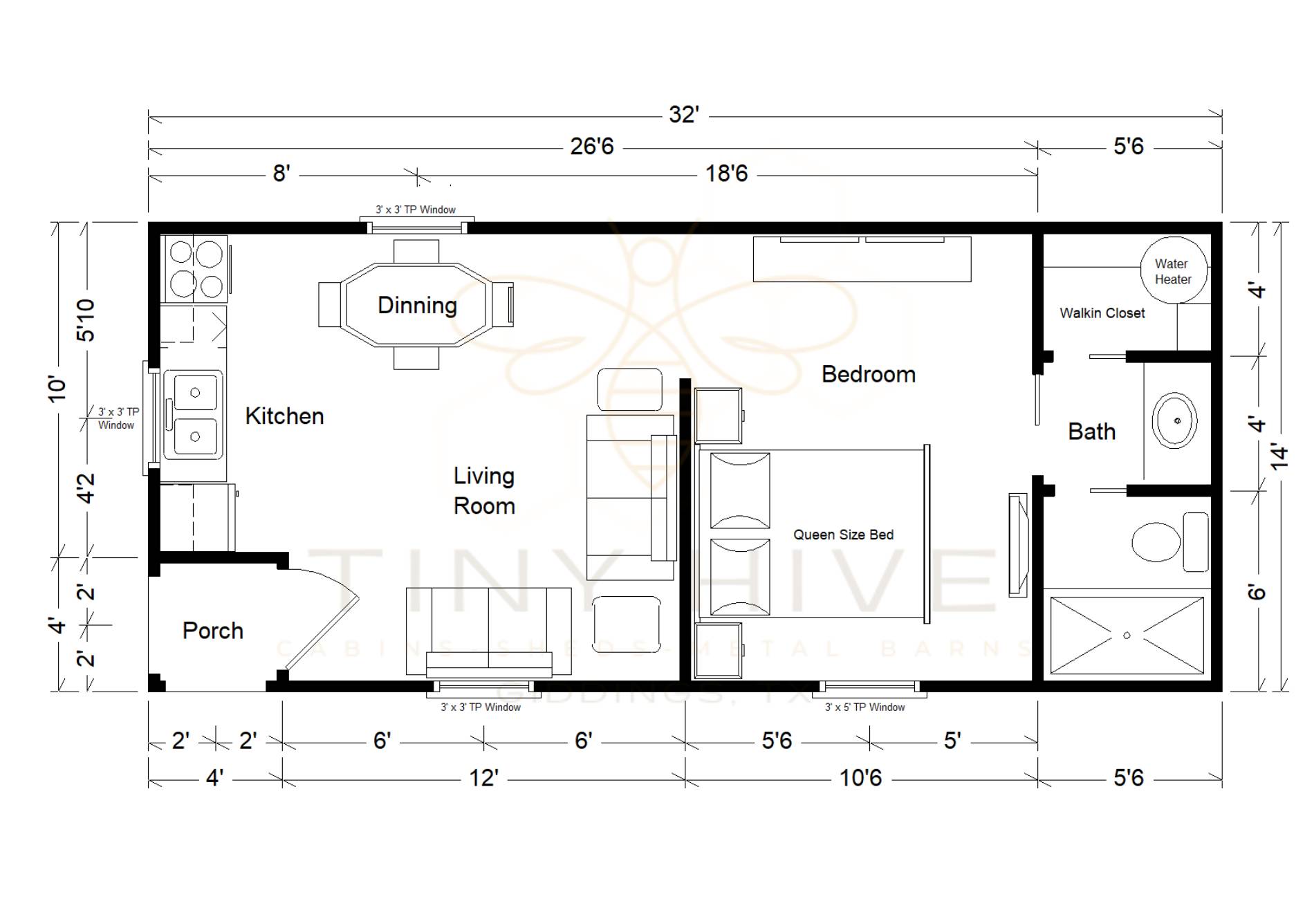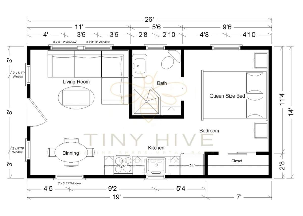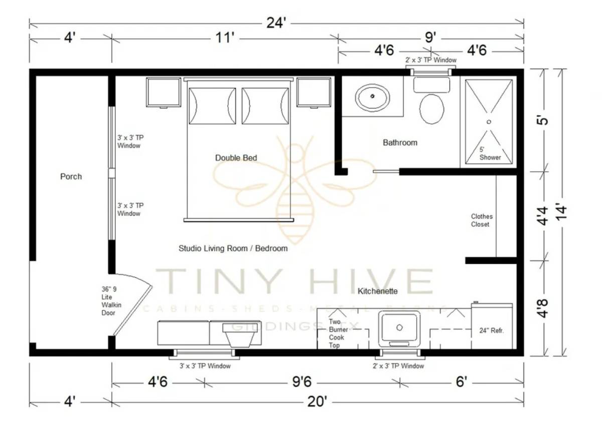 Please note that prices mentioned are subject to change based on the customization of the shell and interior finishes. Clients have the option to halt the build-out process at any time if they wish to complete it themselves. Please ask our sales team to go over the terms and conditions of a cabin build out for more information on customizing the finish out process. Clients are required to pay for all services provided, and the building will be delivered and set up accordingly. The prices mentioned do not include delivery or set-up; they only cover the cost of the building itself. The customer is responsible for connecting utilities once the project is completed. It is important to note that Tiny Hive, LLC does not offer in-house financing for buildings with interior work. The monthly payment estimates for the Rent To Own program are only applicable to the shell of the building from Derksen Portable Buildings. Any interior work is considered aftermarket and does not qualify for the Rent To Own program offered by Derksen.