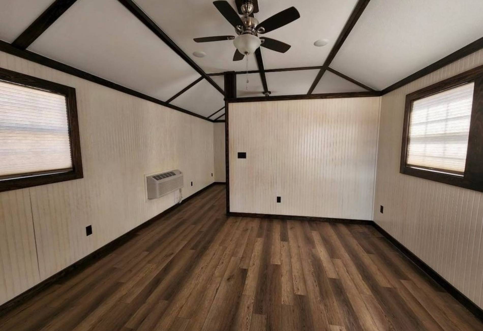 This rustic pre-built hunting cabin has: